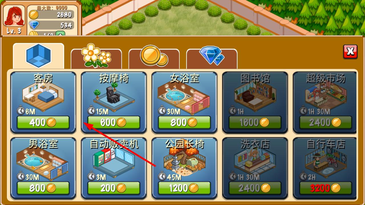 1、进入建筑选择界面,点击右下角商店查看各类建筑如客房按摩椅等,点击对应建筑的金币按钮,即可花费金币解锁该建筑,拓展设施。