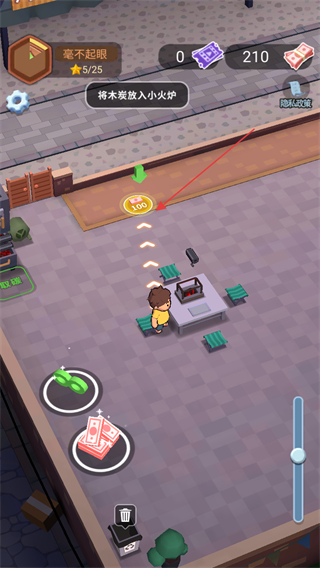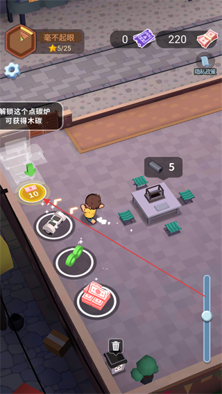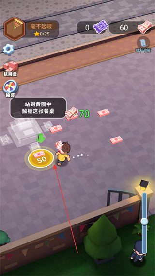 1、操控角色移动拾取场景中的钞票,积累初始资金用于解锁设施。