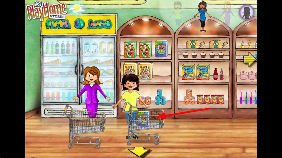 3、超市场景里,操控角色推动购物车,按箭头指引选取货架上商品,模拟购物体验。