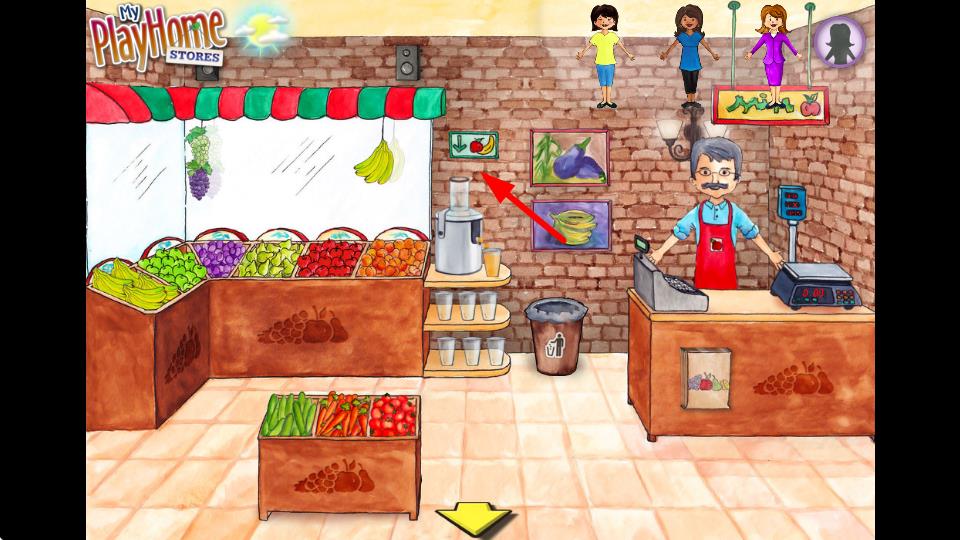1、在水果店场景,水果拖至箭头标识f,可触发榨汁机相关互动,搭配水果进行果汁制作。