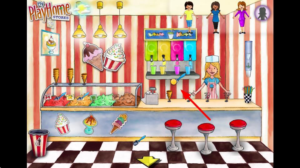 2、冰淇淋店中,按红色箭头指向操作,用对应工具从彩色原料区取物,搭配制作特色冰淇淋。