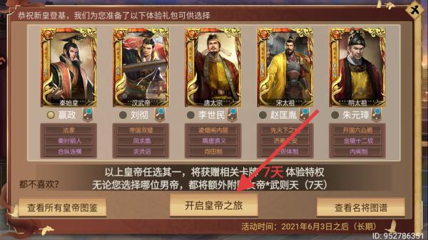 2、涉及角色:秦始皇、汉武帝、唐太宗、宋太祖、明太祖、武则天,选择后可开启皇帝之旅。