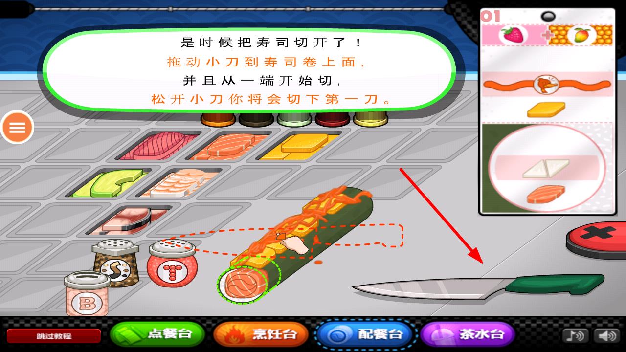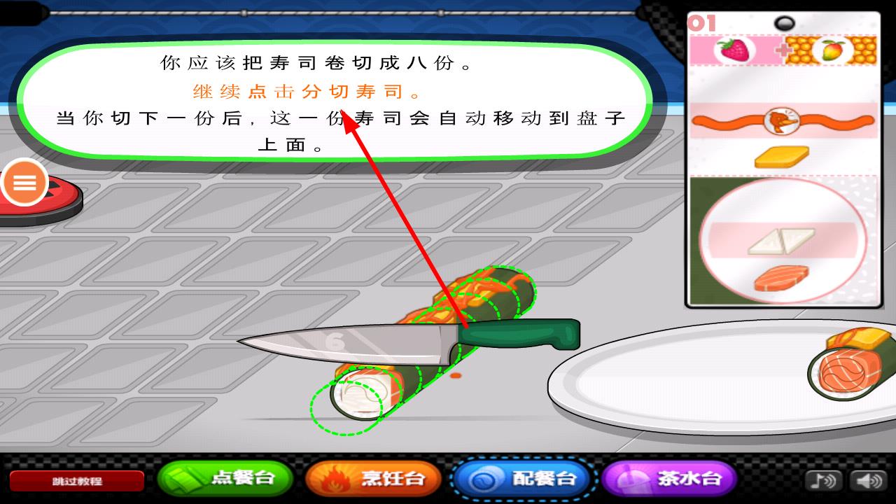 3、按照提示需将寿司卷切成八份,持续点击分切寿司,每切一份会自动移至盘子,重复操作直至切够份数。