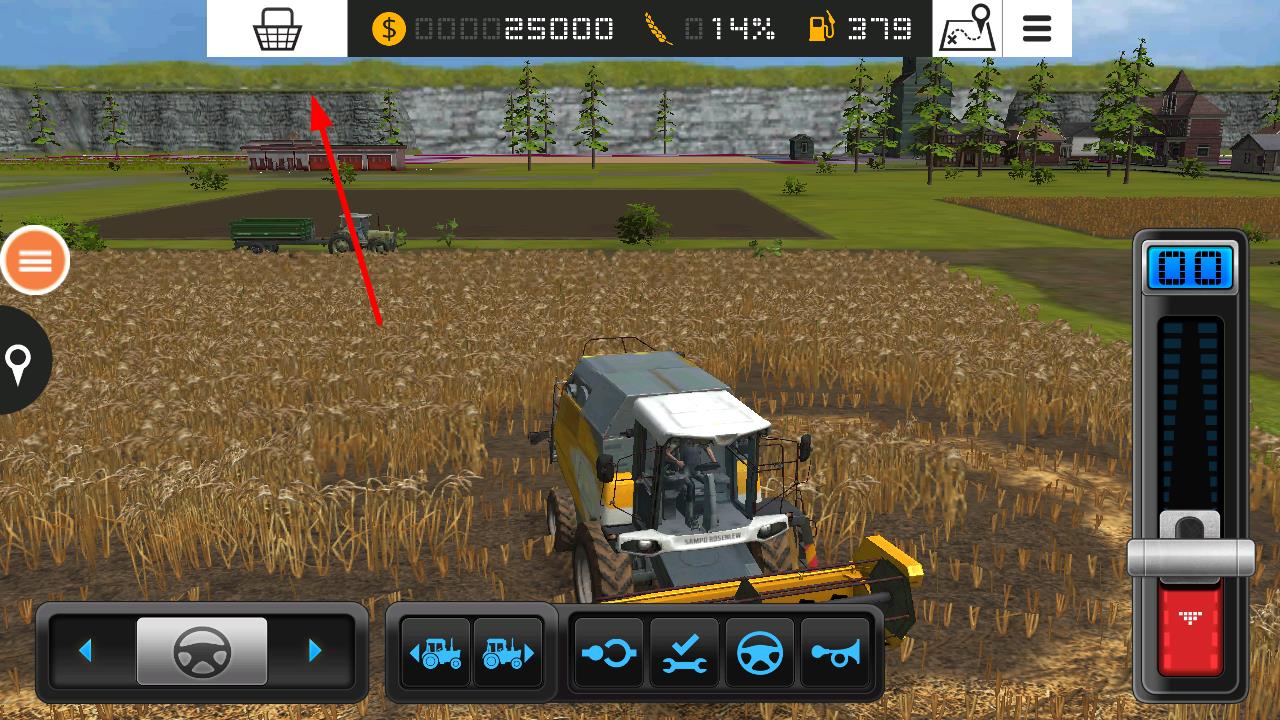 2、在农田作业时-注意屏幕上方显示的作物收割进度已收割14%的作物,当需要购买新设备或物资时,点击屏幕上方的购物篮图标进入商店界面进行选购。