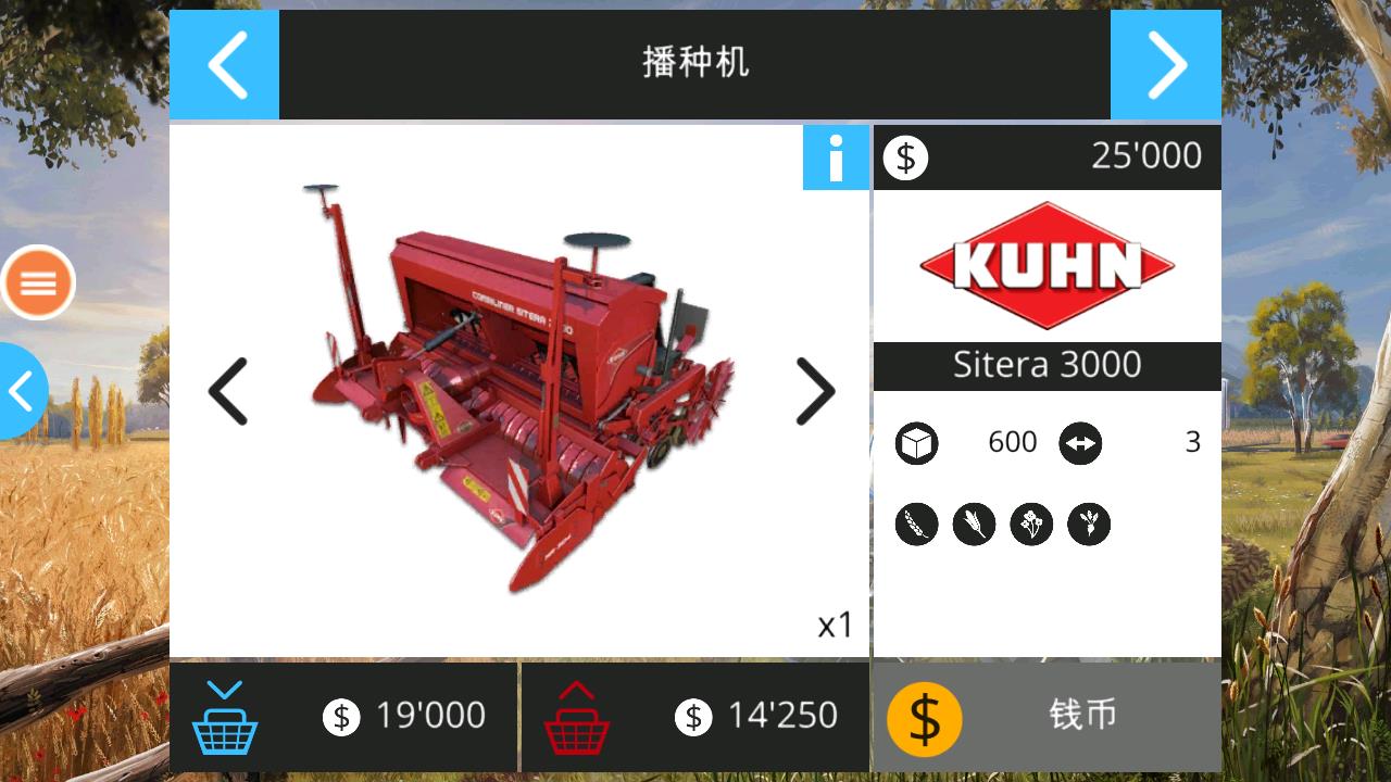 3、若想购买播种机,可在商店中找到它,比如这款KUHN品牌的Sitera-3000播种机-售价25000,根据农场实际需求和自身经济状况-决定是否购买。