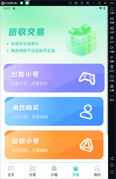 4、点击交易功能进入回收交易界面,在这里可以选择出售小号、购买角色以及回收等操作,不想玩的游戏号可以在这里出售,官方保证安全回收。