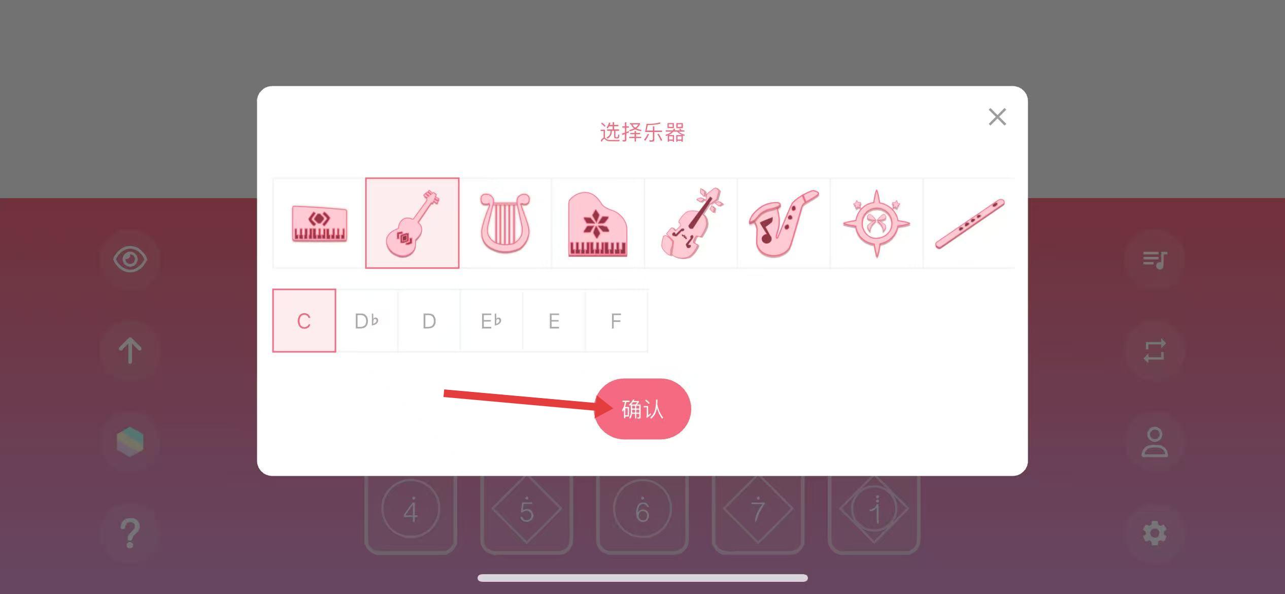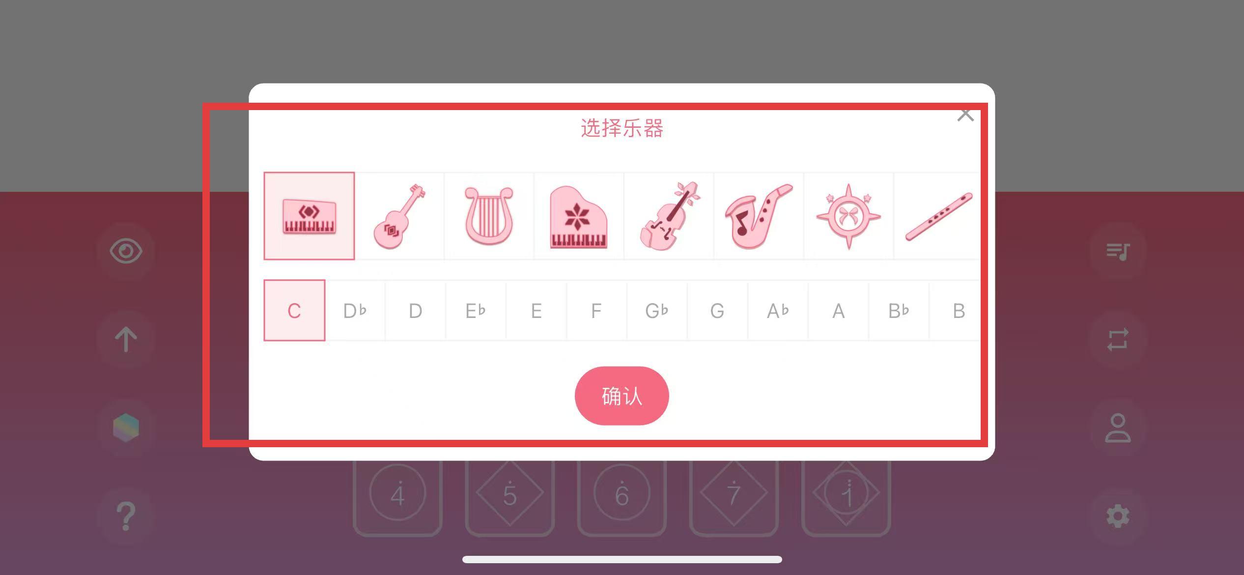 3、点击想要更换的乐器图标,还可选择调号。
