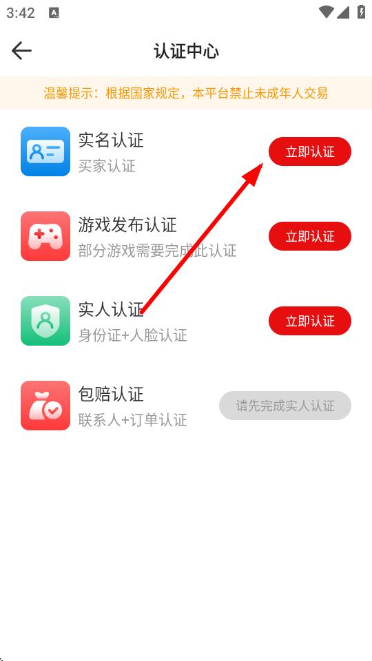 3、进入认证中心页面后,点击实名认证右侧的立即认证选项。