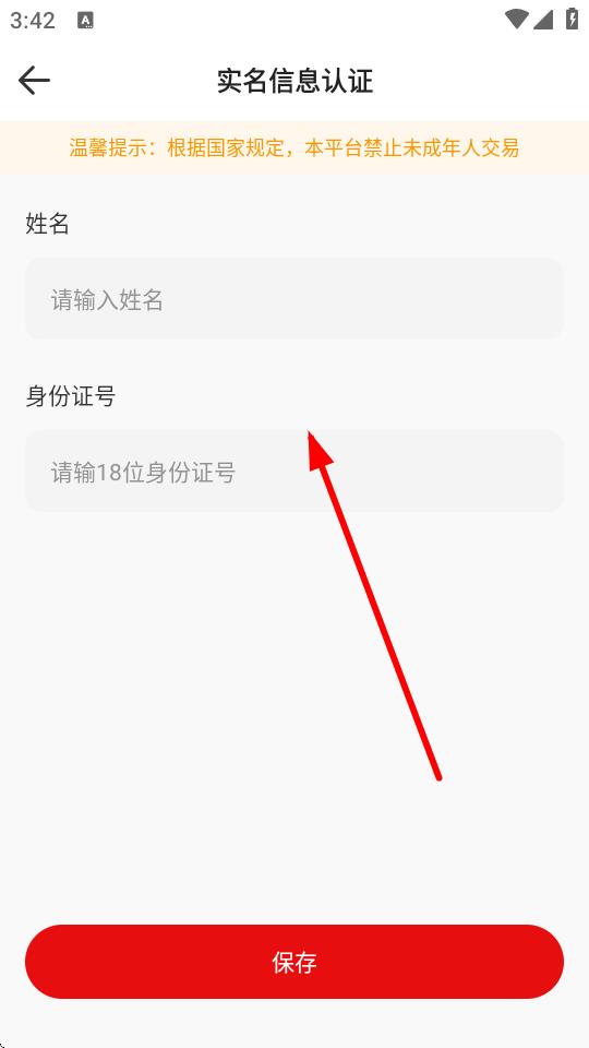 4、在实名信息认证页面,输入姓名和身份证号,点击保存完成实名认证。