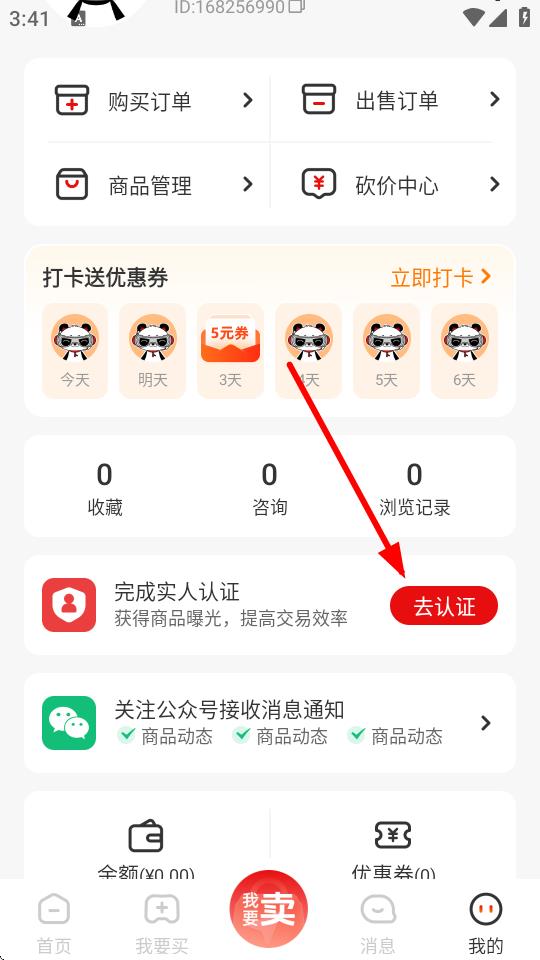 2、在我的页面中,找到完成实人认证板块,点击去认证按钮。