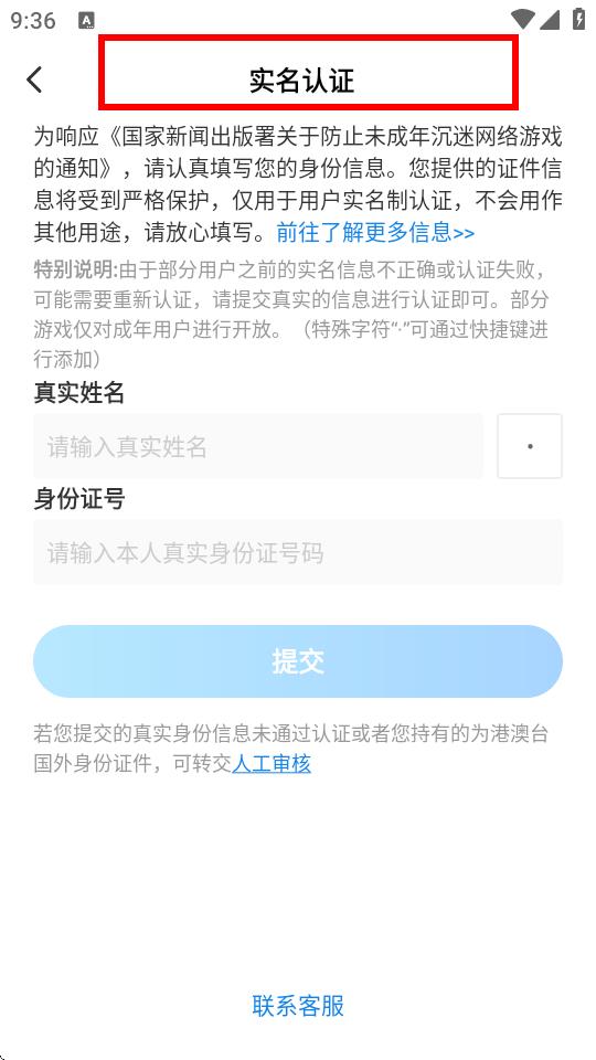 3、进入实名认证页面后,按要求输入真实姓名及本人真实身份证号码,点击提交完成实名认证。