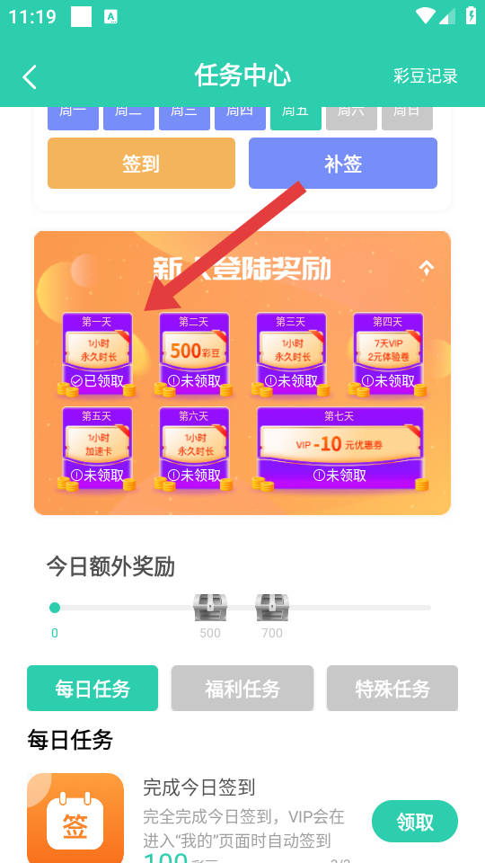 2、点击宝箱进入任务中心页面,点击签到按钮,新人首日可领1小时永久时长,连续签到还能解锁更多天数的免费时长。