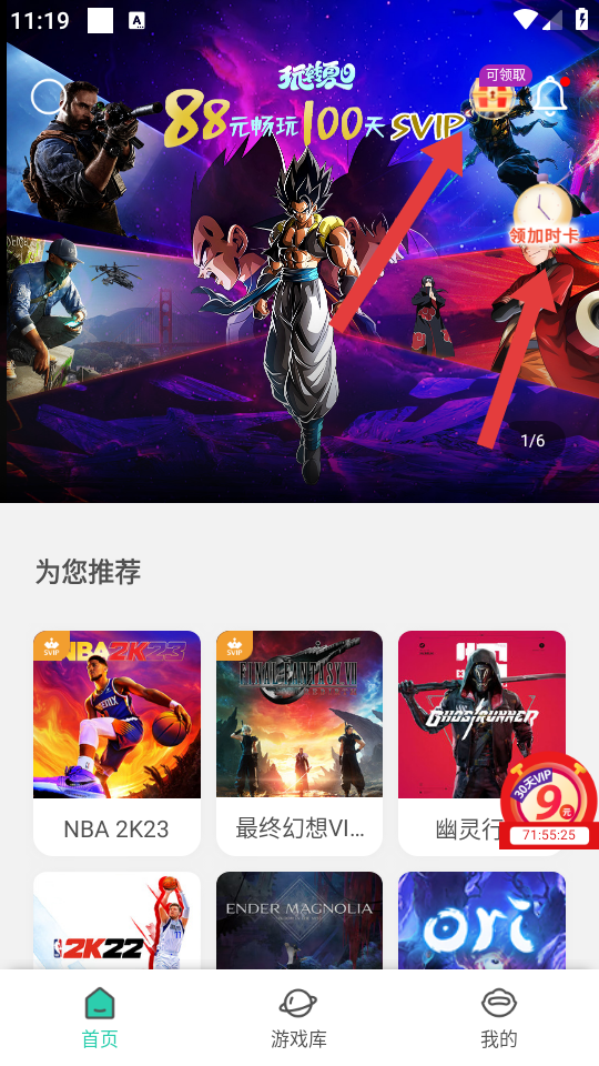 1、进入APP首页,可以选择点击右上角领加时卡和宝箱按钮,来进行领取免费游戏的时长。