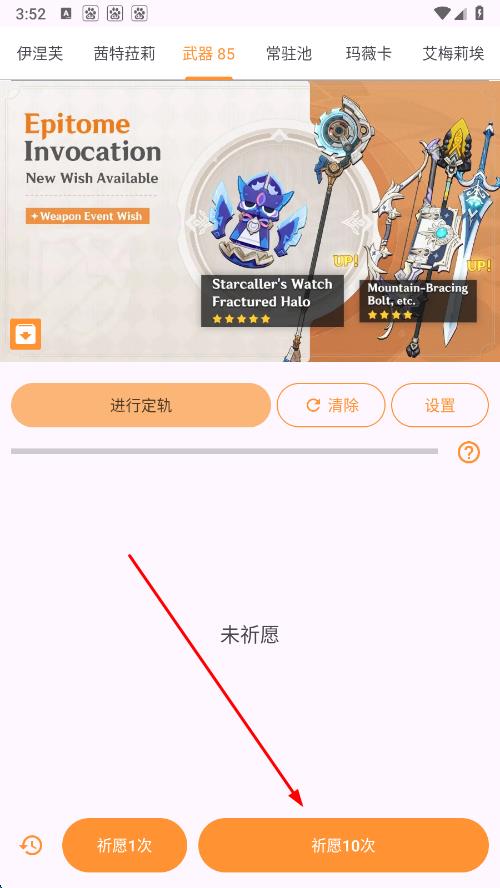 4、完成定轨选择后,点击界面下方的祈愿10次按钮,进行武器抽卡模拟并查看结果。
