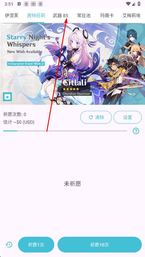 1、打开原神抽卡模拟器,在界面上方找到武器85选项卡并点击,进入武器祈愿卡池界面。