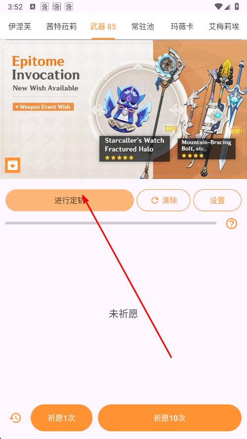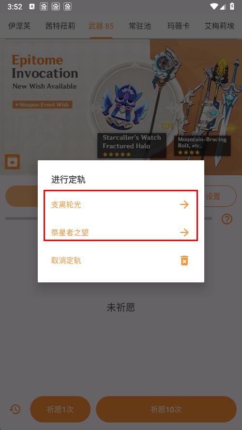 2、在武器祈愿卡池界面中,点击进行定轨按钮,弹出定轨选项。
