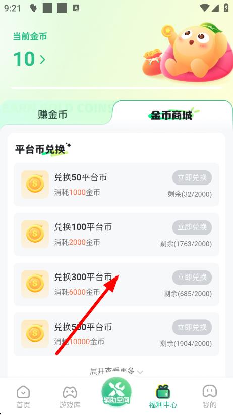 3、在金币商城的平台币兑换栏目下,选择想要兑换的平台币面额,比如兑换300平台币,点击立即兑换,按提示完成兑换。