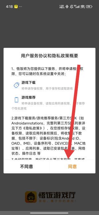 1、打开悟饭游戏厅,阅读用户服务协议及隐私政策概要后,点击同意按钮,进入应用主界面。