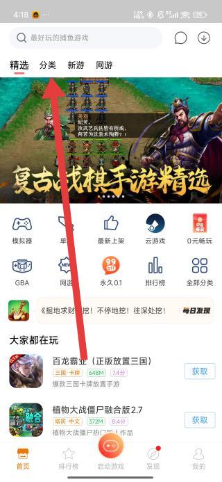2、在悟饭游戏厅主界面,可以点击顶部精选右侧的分类标签,进入游戏分类浏览页面。