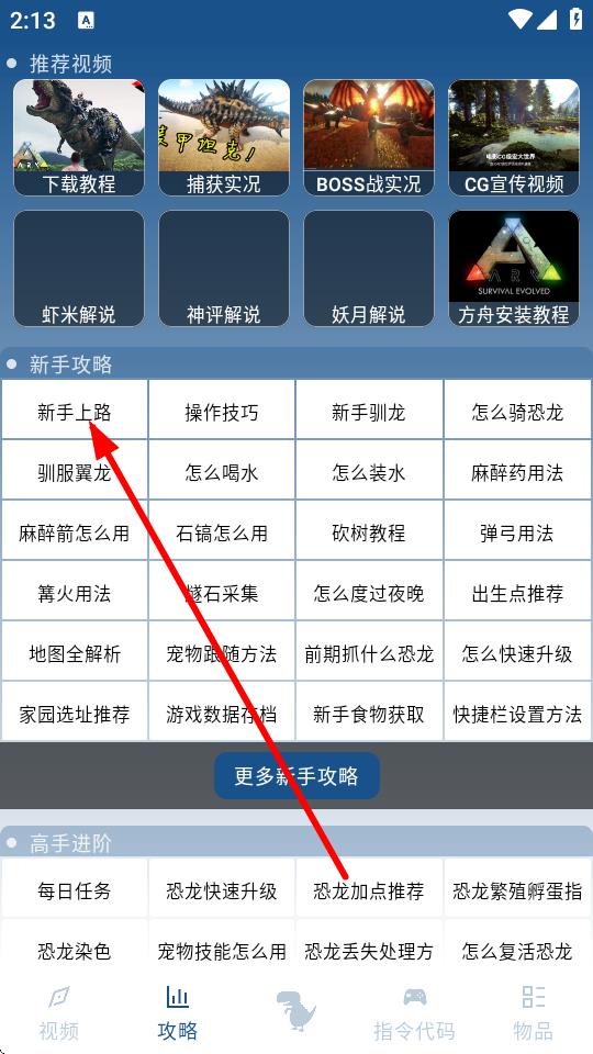 2、进入攻略界面后在新手攻略板块下,点击新手上路。