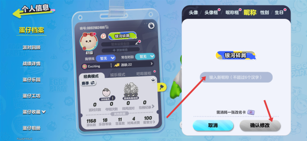 3、在昵称修改界面,删除原有的昵称,输入你想要更换的新昵称 ,点击确认按钮,消耗相应的改名卡,即可完成昵称更换。