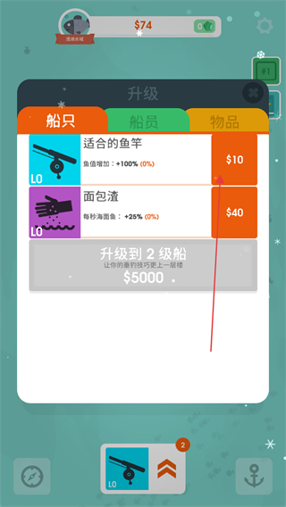 4、在升级界面选择适合的鱼竿等选项,消耗金币提升钓鱼效率。