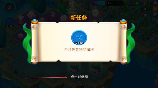 1、接收新任务,需合并任意物品10次,点击继续开始任务。