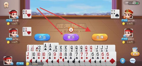 2、进入对局后,手牌区会展示当前持有的所有牌型,当不确定如何出牌时,点击界面中间的提示按钮,系统会基于当前局势给出合理的出牌建议。