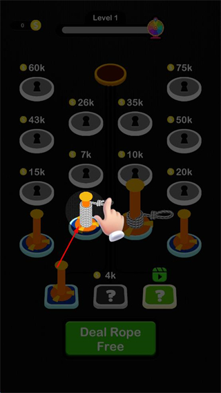 1、进入软件第1关界面,找到带有绳索的立柱,点击该立柱上的绳索,开启绳索解开操作。