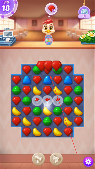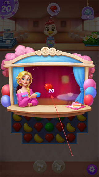 1、明确关卡目标收集20颗红宝石,进入棋盘后优先消除红色爱心糖果,快速积累红宝石数量。