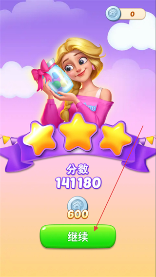 4、达成20颗红宝石目标后,获得三星通关评价,点击“继续”进入下一关。