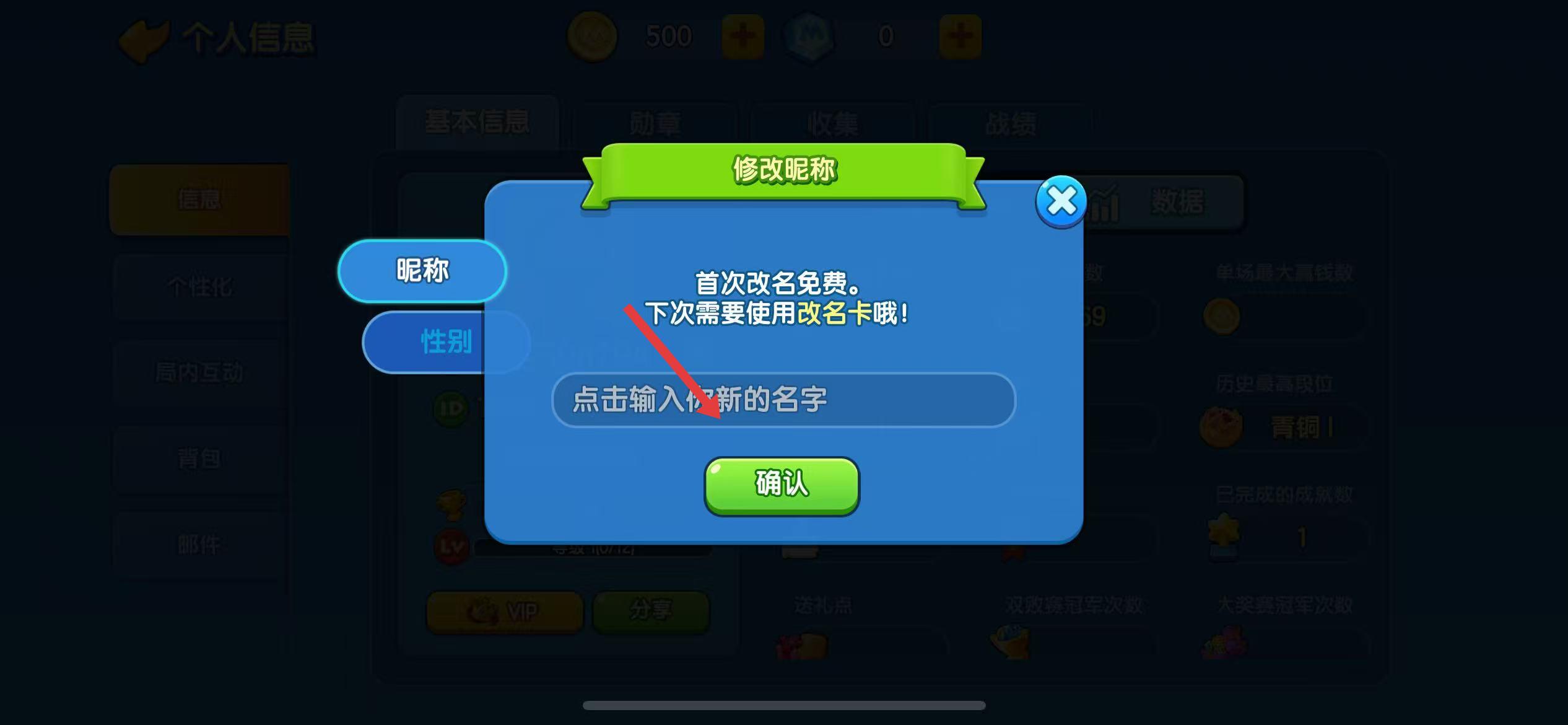 1、在游戏主界面,点击左上角头像图标,进入个人信息页。