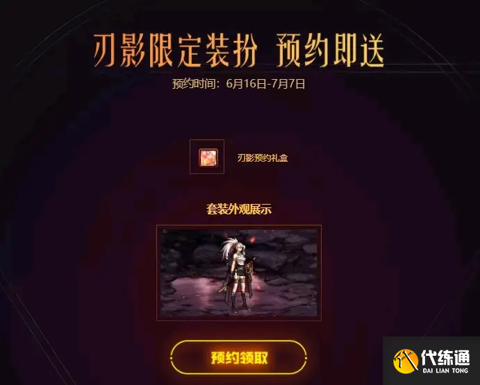 伴随新职业刃影的开放,官方也开放了四个活动首先进入预约活动页面后点击右上角的预约即送限定装扮,点击弹窗中的预约领取按钮,即可成功预约并领取刃影预约礼盒,单Q限领1次。毒奶粉玩家一定不要错过哦!