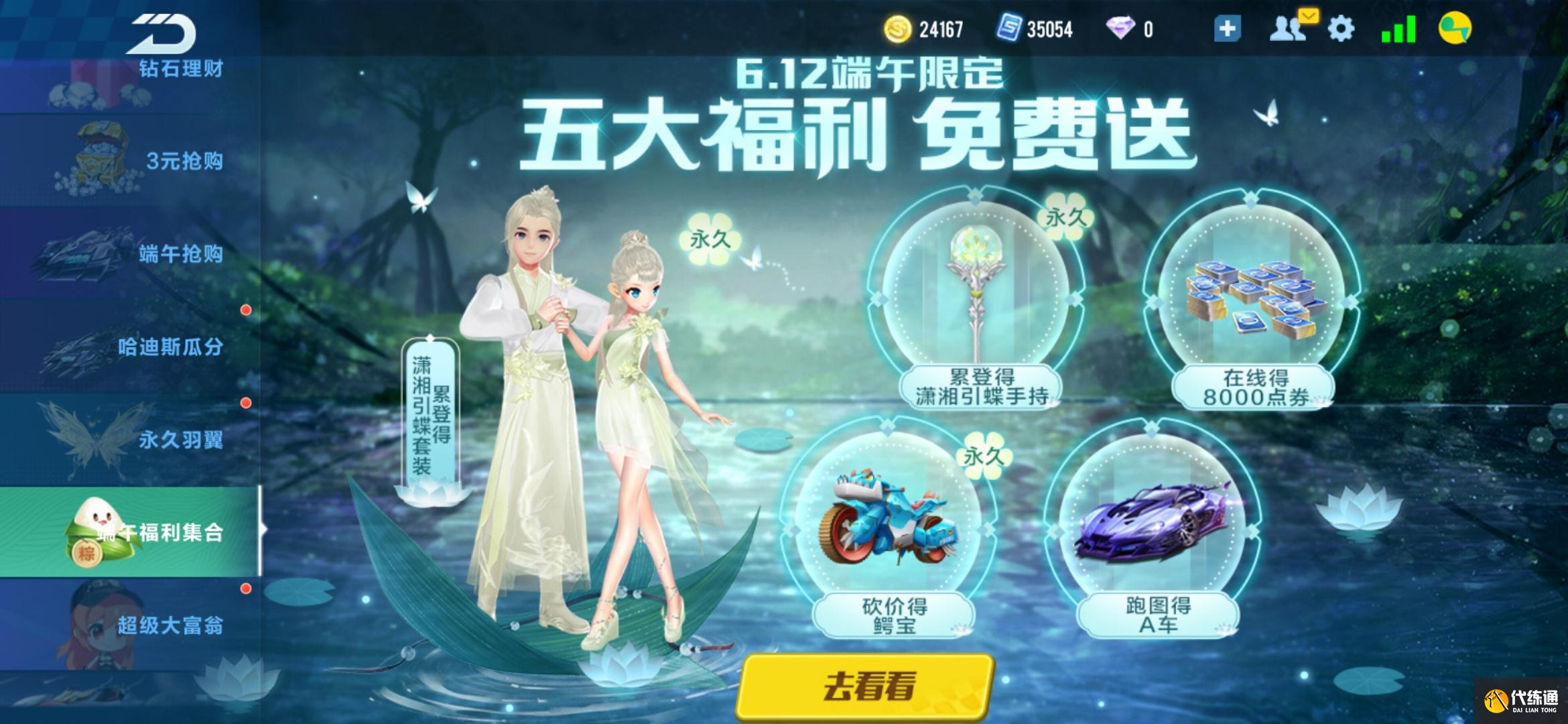 登陆1天就能获得一套潇湘引蝶服饰,和一个哈迪卡祈愿卡(可用来祈愿点亮十二星座)。