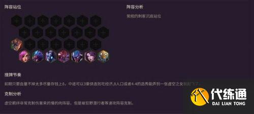 前期只要血量不掉太多,尽量存钱上8,中途可以3豪侠连败吃经济,8人口或4-4选秀弄到一张虚空之女就起飞了。