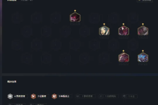 3阶段:通常在3-2升级6人口,这阶段主要目的还是为了稳定血量,看自身打工阵容强度如果略差,可考虑小D一波提升质量。阵容开始像黑夜铁盾亚索转型,这时候就能搭配4黑夜+3神盾的强势阵容,只要不遇到天胡哥均能连胜。