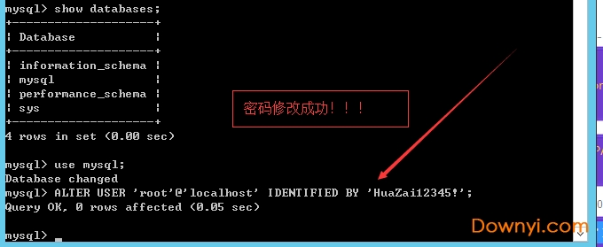 初始化登录是不需要密码的,直接输入命令“mysql-uroot-p”直接回车登录,显示库输入命令“showdatabases;”,连接到mysql的库,输入命令“usermysql;”,然后才修改mysql密码,输入修改语句“alteruser'root'@'localhost'identifiedby'huazai12345!';”进行修改,修改成功如下图: