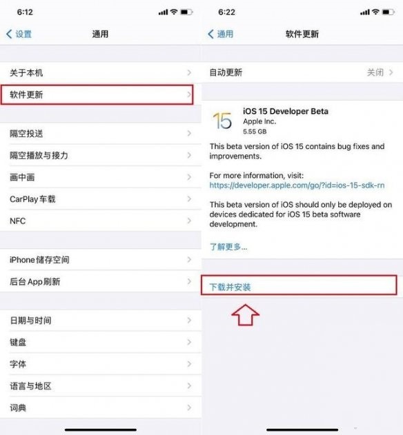 3.安装完成并重启后,打开 iPhone 的「设置」-「通用」-「软件更新」,之后就可以在线检测到iOS 15最新测试版系统更新了,之后再点击下方的「下载并安装」根据提示,在WiFi网络下,就可以根据完成OTA在线升级系统。
