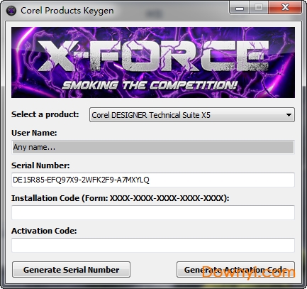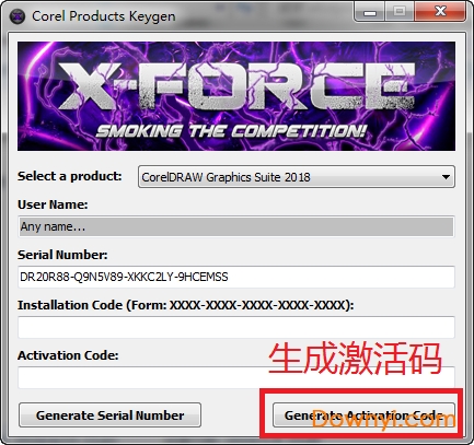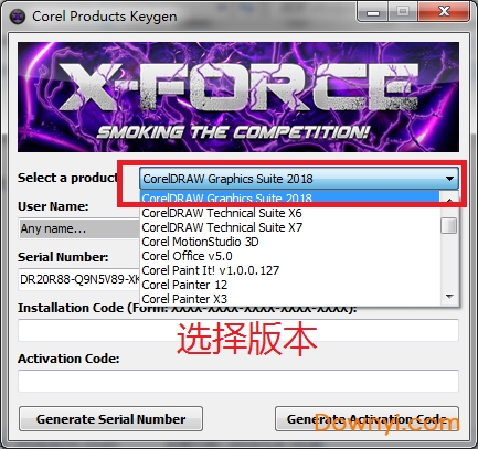 3、选择好Corel产品版本,然后点击“generate serial number”生成序列号按钮生成安装序列号!记得不要关闭注册机,一会儿还要激活程序;
