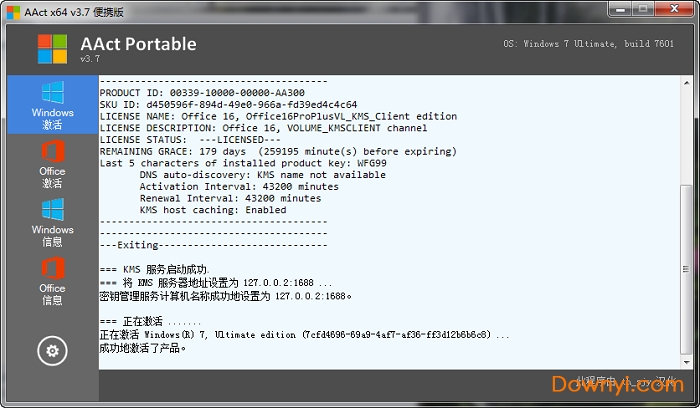5、激活之后,点击windows信息、office信息就能够查看激活信息,在该窗口中可以看见关于激活产品的名称、密匙等等;