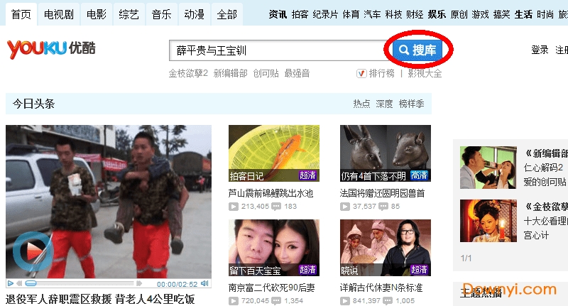 比如,现在我们想下载《薛平贵与王宝钏》,可以访问 优酷网首页,输入“薛平贵与王宝钏”,然后点击“搜库”按钮:
