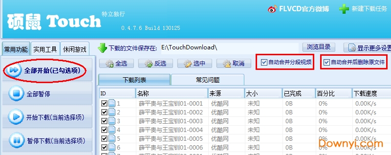 在Touch下载器中设定好视频存储路径后,点“全部开始(已勾选项)”就开始批量下载整部电视剧了。