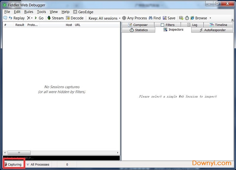 4、打开Fiddler软件,确保软件左下角红色框是录制的状态,如下图所示: