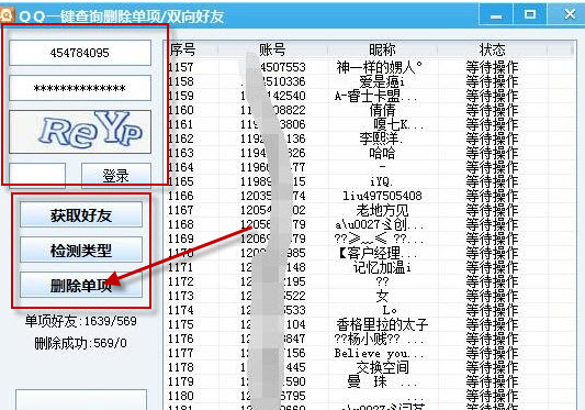 删除QQ好友:软件支持批量删除QQ好友,支持单向删除:把QQ好友从自己列表删除,但是对方的好友列表还有自己的QQ;双向删除:拉黑名单,把QQ好友从自己列表删除的同时,把自己的QQ从对方QQ列表删除(id通道删除,每50个好友需要一个验证码);